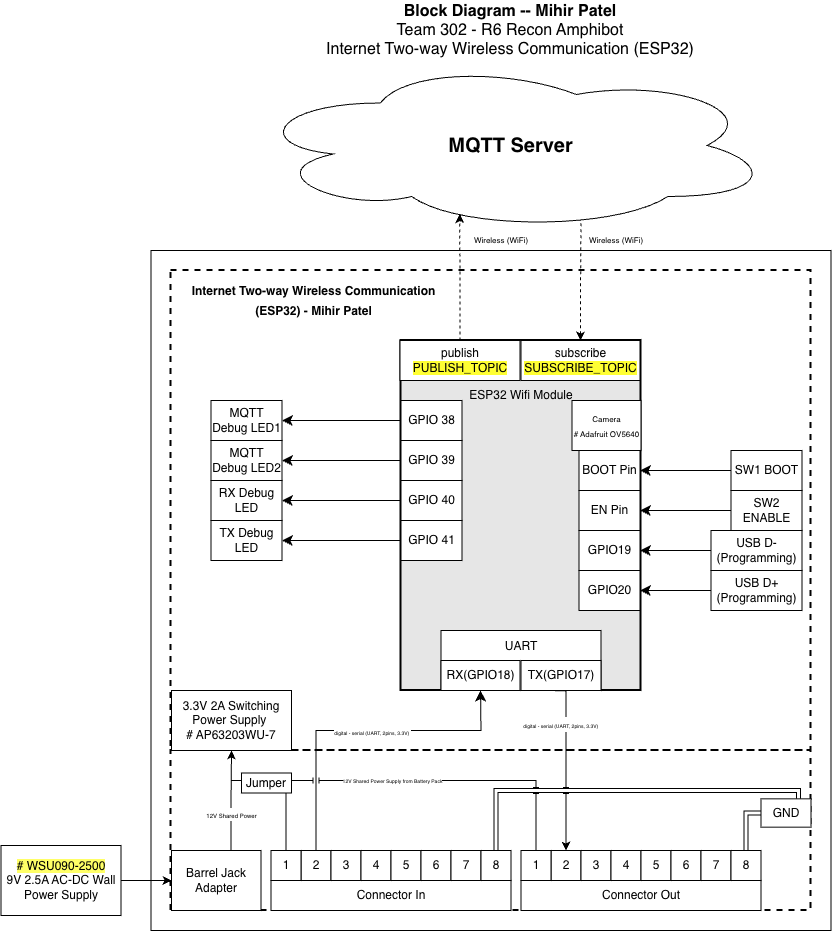 This block diagram represents the ESP32-based Internet Two-way Wireless Communication subsystem developed by Mihir Patel for Team 302 – R6 Recon Amphibot. The purpose of this subsystem is to act as the team’s wireless gateway, enabling remote communication with the operator while coordinating data exchange between onboard subsystems through a UART daisy-chain architecture.