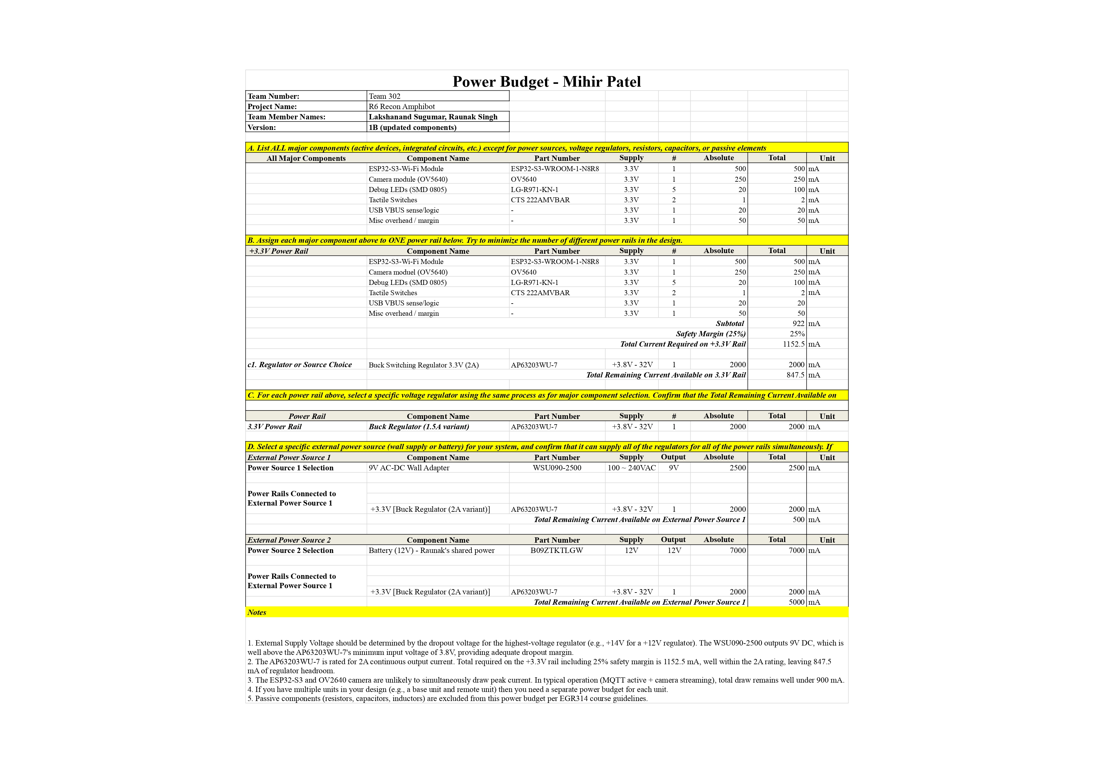 The same budget was used to verify both external power sources. The primary standalone source is the WSU090-2500 9V AC-DC wall adapter, rated at 2500 mA. The secondary source is the team's shared 12V battery (B09ZTKTLGW), rated at 7000 mA. Both sources feed the AP63203WU-7 through onboard protection diodes (MBRS340T3G), and either source alone is sufficient to power the entire +3.3V rail. With the 9V adapter, 500 mA of headroom remains on the supply after accounting for the regulator's maximum draw. With the 12V battery, 5000 mA of headroom remains.